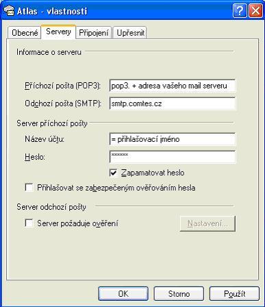 » v nastavení Vašeho poštovního účtu, v záložce "Servery", do kolonky "Odchozí pošta(SMTP):" doplňte smtp.comtes.cz, viz. obrázek níže. Obecně řečeno, do této kolonky se vždy vkládá adresa poštovního serveru Vašeho poskytovatele internetového připojení, který jej pro tento účel poskytl. Kliknutím na "OK" se nastavení uloží a Váš poštovní program už "ví" přes který server má Vaši poštu odeslat.